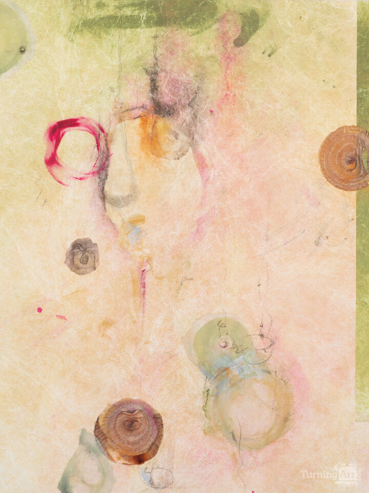 This exploration continues in a newer series of paintings and collages. The repetition of circles is a way of making sense of chaos—as well as an invitation to enter other realms of consciousness in search of peace, healing, and a deeper understanding of our impermanence.
