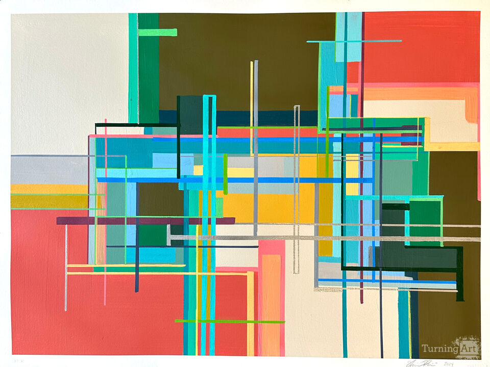 This abstract painting explores structure, balance, and movement through layered geometric forms and intersecting lines. Bold blocks of color overlap with translucent passages, creating a sense of depth and spatial rhythm reminiscent of architectural plans or urban landscapes. The composition feels both ordered and dynamic, allowing the eye to move across the surface while discovering subtle shifts in color and alignment. This work brings energy and sophistication to a space, making it well suited for modern and contemporary interiors.