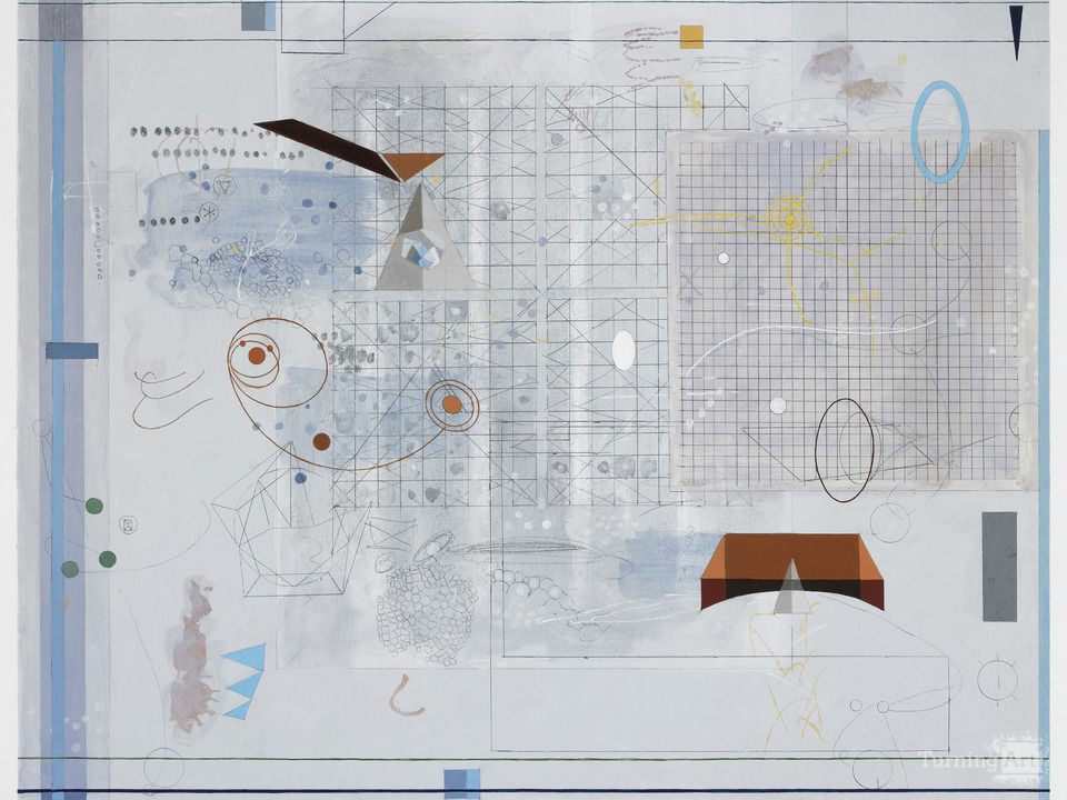 This mixed media painting contains elements drawn with pencil, and painted areas of acrylic, and gouache. Using an underlying grid structure, several geometric forms emerge from the field, that either are developed from the grid structure or in contrast to it. There are also subtle references to more organic forms that are also related to grids in that they are constructed from repetitions of shapes. For me this painting was a playful exploration of design structures seen in nature and architecture.