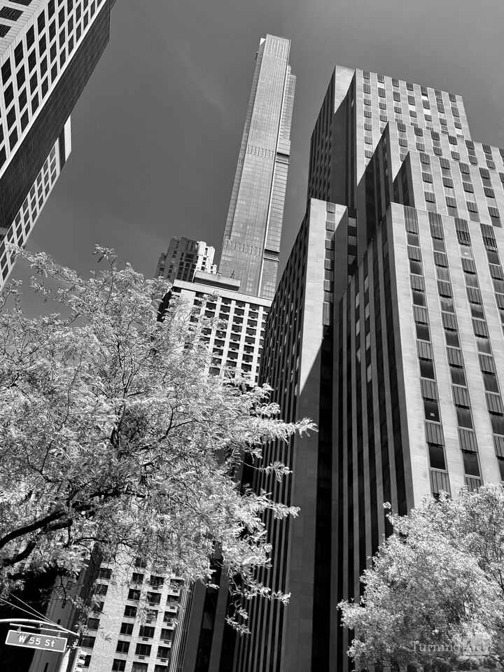Framed in black and white, the facades of West 55th tower like modern monuments — a reflection of Manhattan's relentless ambition. Seen from a low, angular perspective, every line and shadow whispers of big personalities and bolder ideas shaping the skyline. One slender tower soars above the rest — a statement of growth, distinction, and unshakable drive.