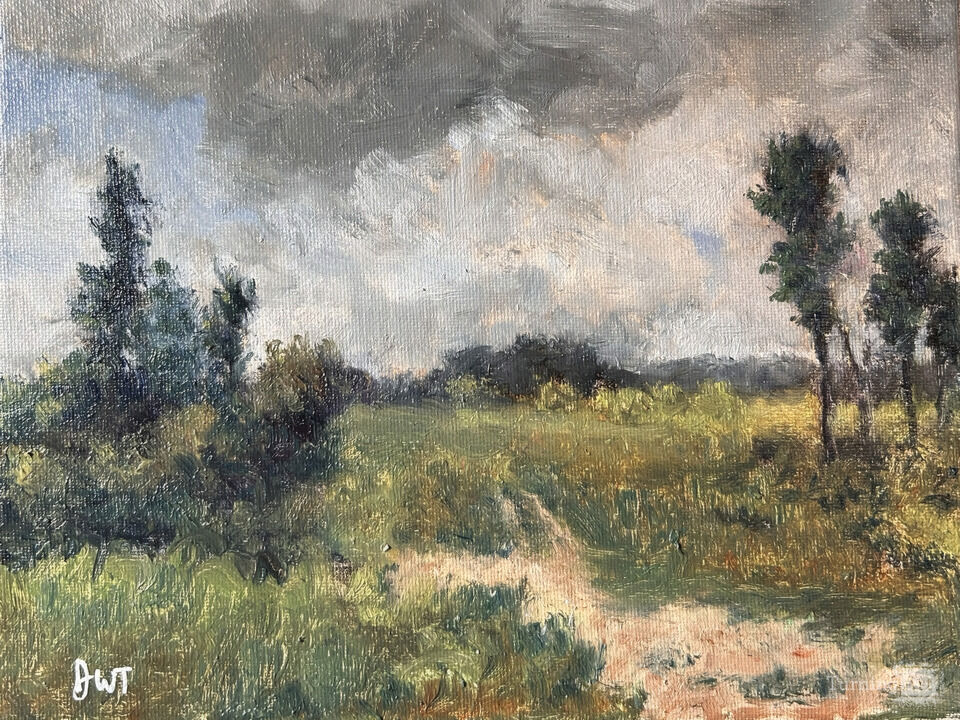 This small plein air oil painting captures a stormy summer sky over a field. I used expressive brushwork to suggest a dynamic and changing atmosphere. I was motivated to paint this scene by the dramatic clouds and the way the light fell on the path and the tall grasses. It's a snapshot of a peaceful moment just before a storm, painted on-site at a nearby forest preserve.