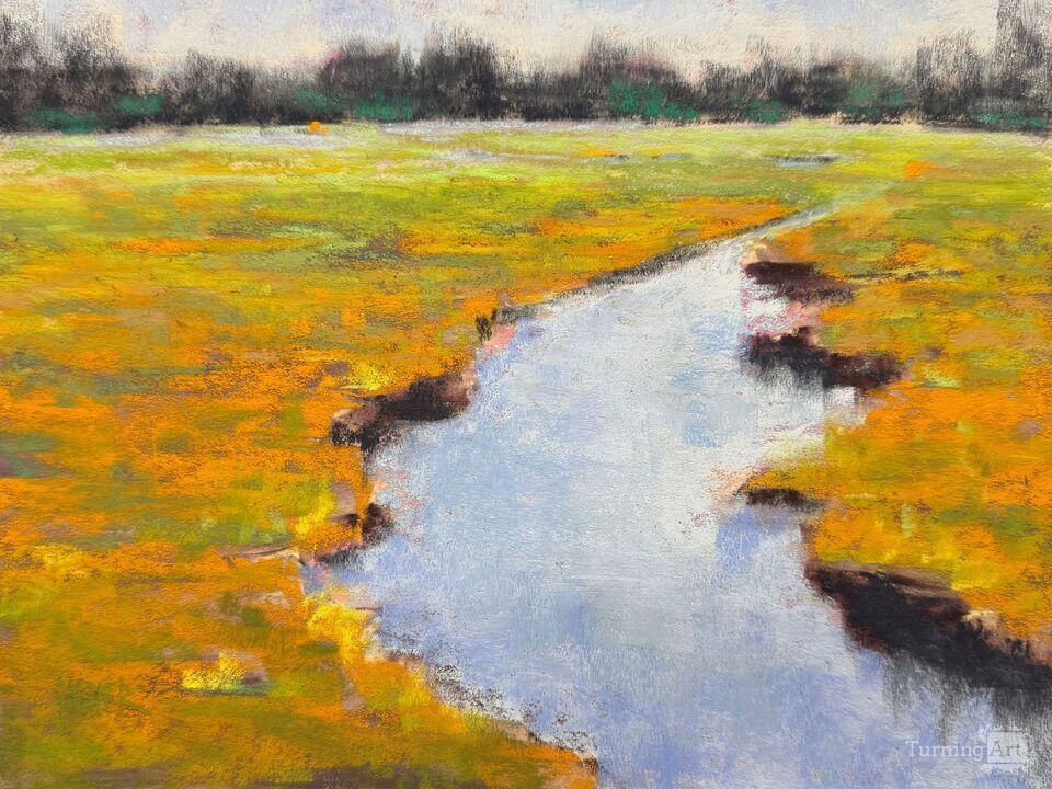 I love the changes of seasons and the juxtaposition of both warm and cool colors in the landscape. I began this piece with four values in the pink/purple family and letting them peek through the upper layers of pastel adds both depth and visual warmth to this painting.