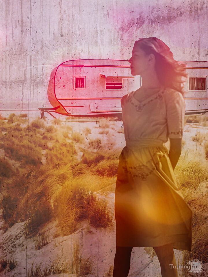 In the vintage landscape artwork WHEN TIME STOOD STILL a woman stands still in the tall, withered dune grass. Behind her is an old caravan on the edge of the dunes, with the suggestion of a sea behind it, hidden in a mysterious, hazy mist.