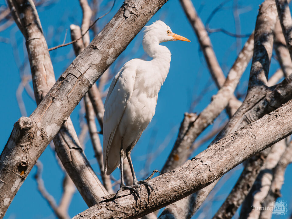 Perched gracefully on a sturdy branch, this elegant egret stands out against a brilliant blue sky. The intricate details of the tree's bark contrast beautifully with the bird's smooth feathers, creating a serene moment in nature. This artwork invites you to appreciate the simple beauty of wildlife and the tranquility it brings. Perfect for adding a touch of nature to your space, it’s a delightful reminder to pause and enjoy the little things.