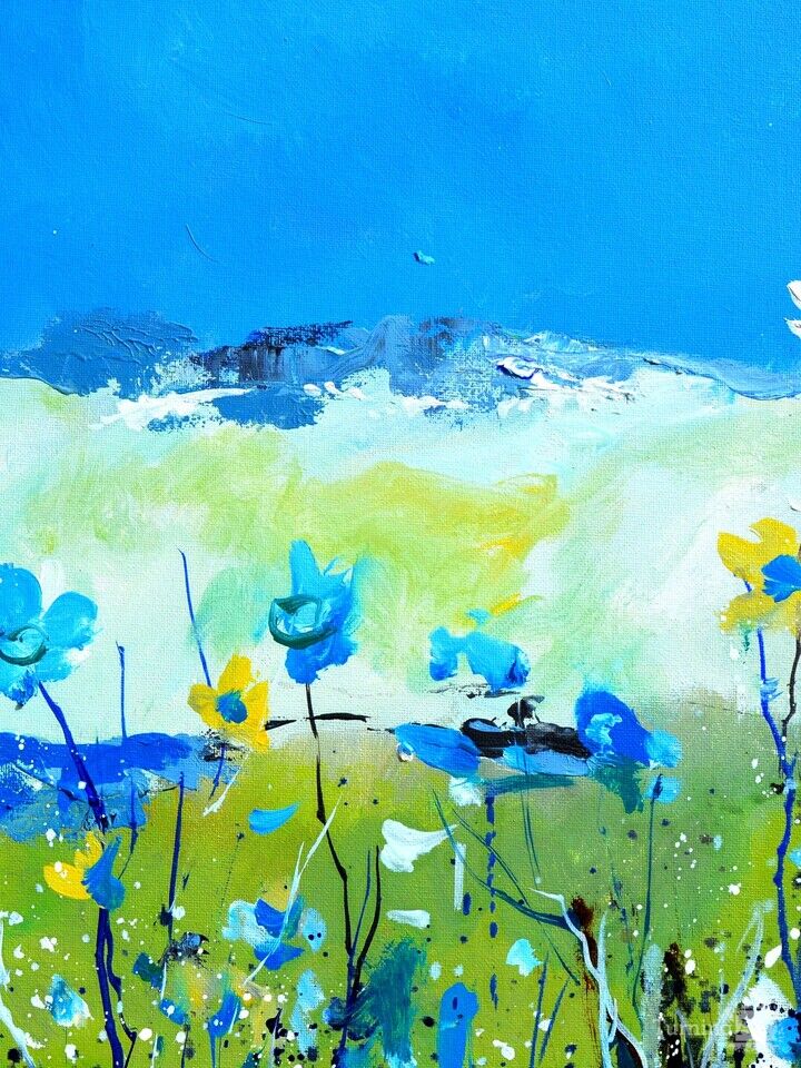 This painting captures the spontaneous beauty of a wildflower meadow with expressive brushwork and a vibrant palette of blues, greens, and whites. The loose, impressionistic style evokes a sense of movement and freedom, as if the flowers are swaying gently in the breeze under a vast, open sky. The artist's playful splatters and bold strokes infuse the scene with energy, making it feel both serene and alive. A refreshing celebration of nature's quiet vitality.