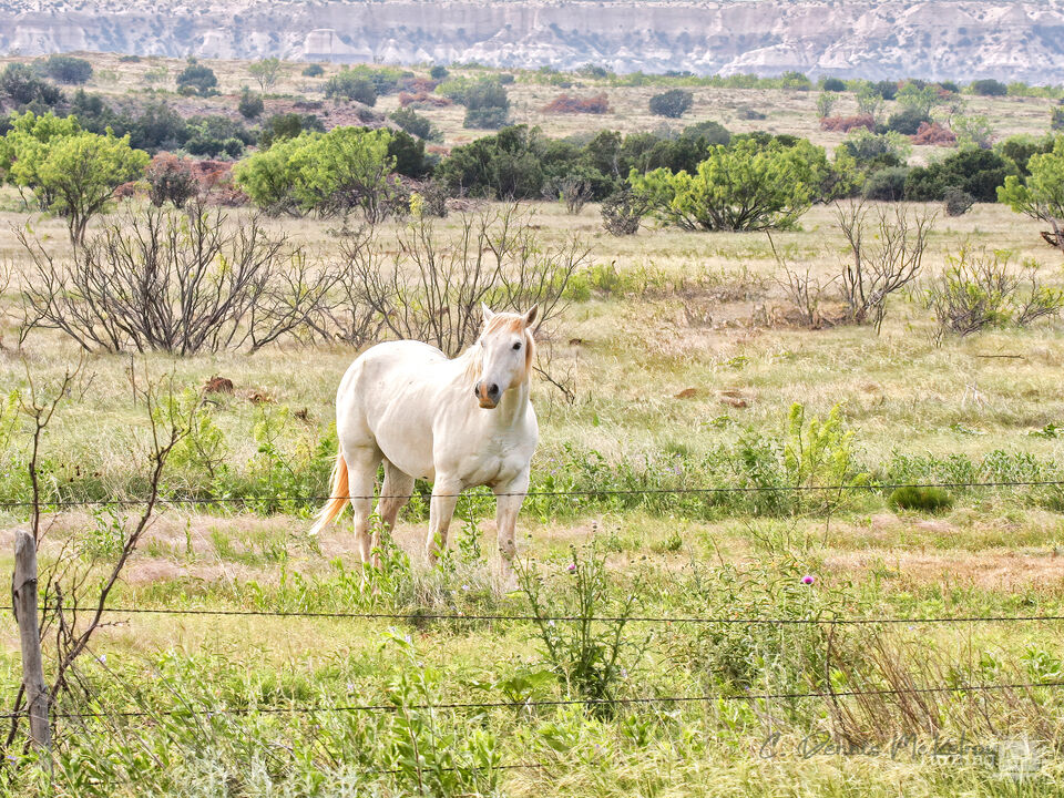 With the Palo Duro Canyon in the background the very stout white horse stands firm looking very strong in a rugged environment. The colors in the image intermingle enhancing the varying shades in the horses mane and tail. The sun light helps to bring out the detail as well.