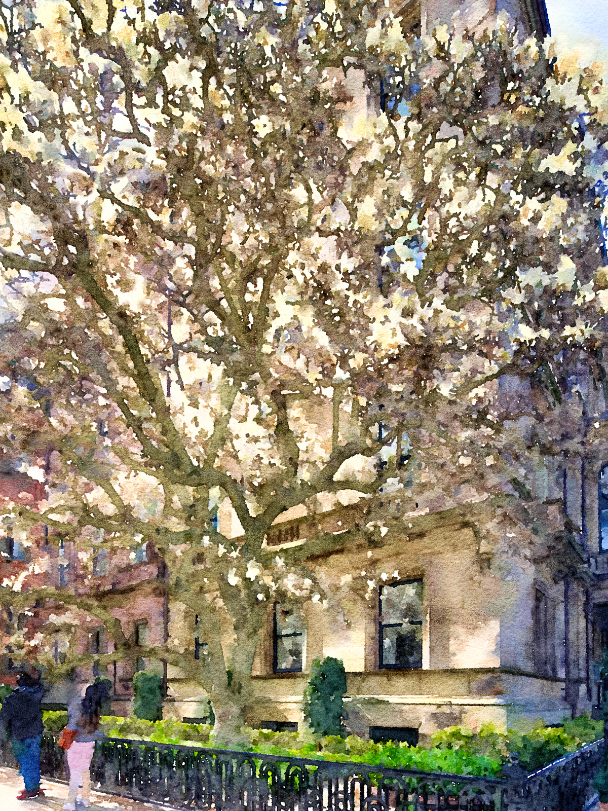 Every April, the magnolias on the south-facing side of a mile-long section of Commonwealth Avenue burst into bloom. Most are light pink to magenta, but a few are of the white variety. This one is on the corner of Arlington Street and Commonwealth Avenue in front of the historic Harbridge House.