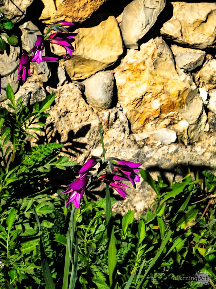 Vivid wild penstemons against an ancient stonewall in the forest.