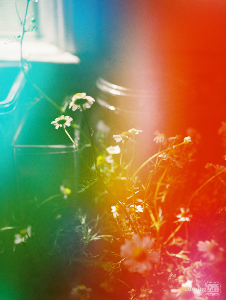 Colorful photo taken of wild chamomile flowers on Dubblefilm's Jelly color fogged 35mm film.