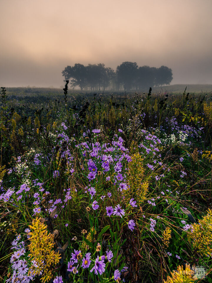 A field of wildflowers, in Delafield, WI, in full bloom, lies under a misty sky. Trees in the distance are shrouded in fog, creating a serene atmosphere.