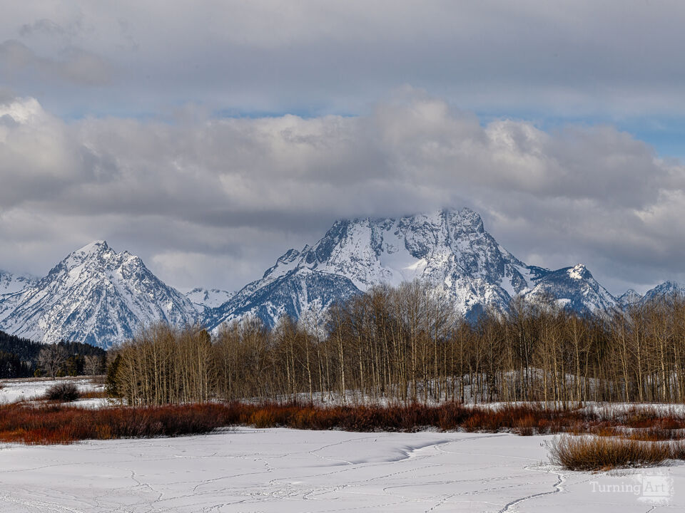 A cold, cloudy winter morning at Oxbow Bend in Grand Teton National Park. The Snake River lies frozen and snow-covered in the foreground, its surface etched with the tracks of wildlife. Bare cottonwoods line the bank in pale gold, rust-red willows the only warmth in an otherwise cold and quiet world. And presiding over it all – a snow-covered Mt. Moran, its summit wrapped in clouds, but still as commanding as ever.