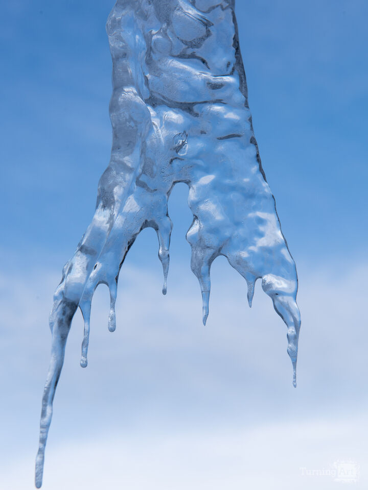 This close-up photograph of a melting icicle against a soft blue winter sky captures nature's sculpture at its most transient and beautiful. The icicle's irregular, branching form — splitting into multiple dripping fingers — gives it an almost organic, creature-like quality, its glassy blue-tinged surface reflecting the sky above. The image operates on multiple levels: as a pure study in form and light, as a quiet meditation on impermanence and seasonal change, and as an abstract near-sculpture against an open sky. The cool blue palette and crystalline detail make it a fresh, elegant choice for contemporary interiors. It will appeal to anyone drawn to winter beauty, abstract nature photography, or minimal color palettes.