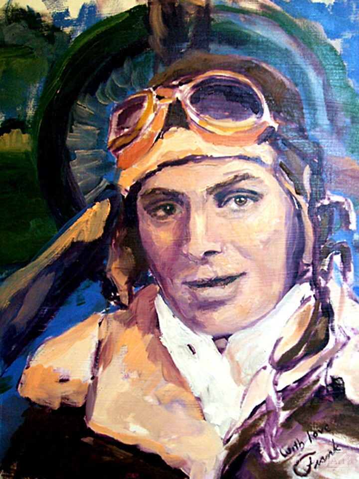 My Uncle Frank was a member of a B-17 crew during World War II. He sent to his parents, a picture of himself in his flight uniform. This painting is based on that old black and white photo. Fortunately, he survived the war all in one piece.