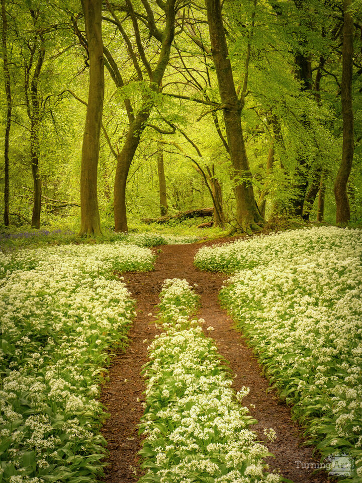 Whimsical woodland trees surrounded by blooming wild garlic in the English countryside during springtime.