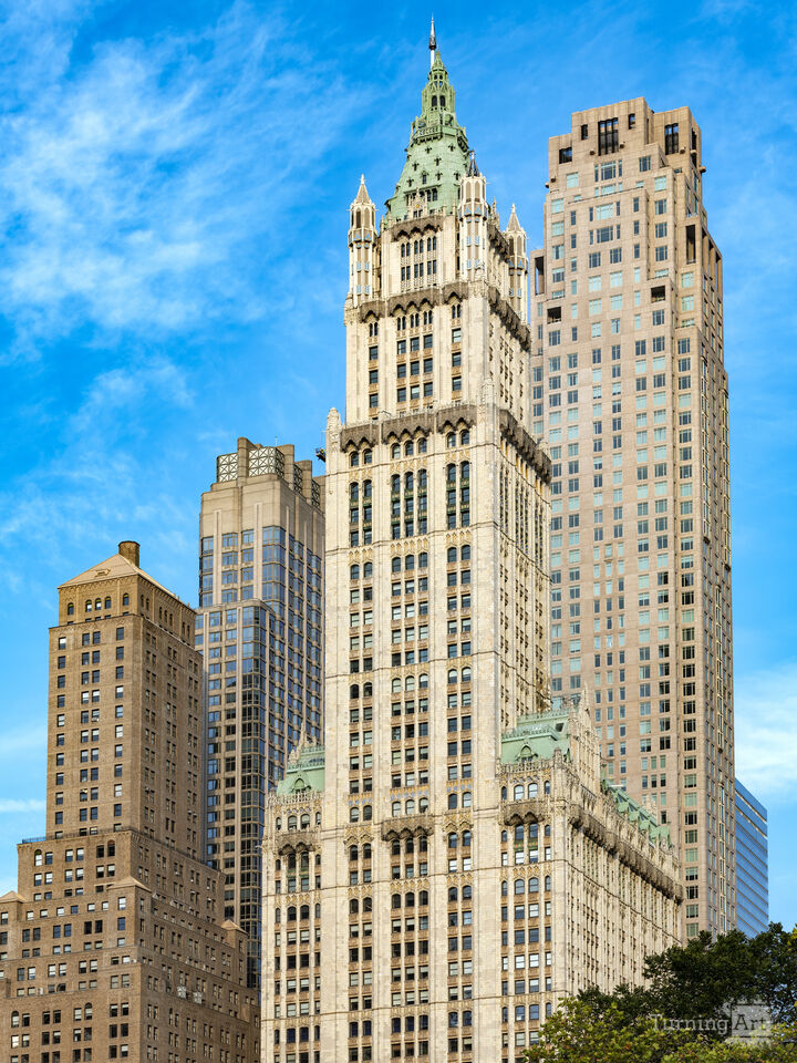 Historic and modern skyscrapers create a dense urban landscape in the financial center of New York City.