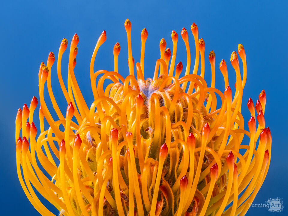 I've always been fascinated by the beauty and wide variety of Proteas. However, until recently, I've found it difficult, if not impossible, to produce coherent closeups of them. The Leucospermum "Pincushion" variety is a happy exception. I spied a bouquet, called "California Sunshine", in a local florist's and decided to experiment with it.