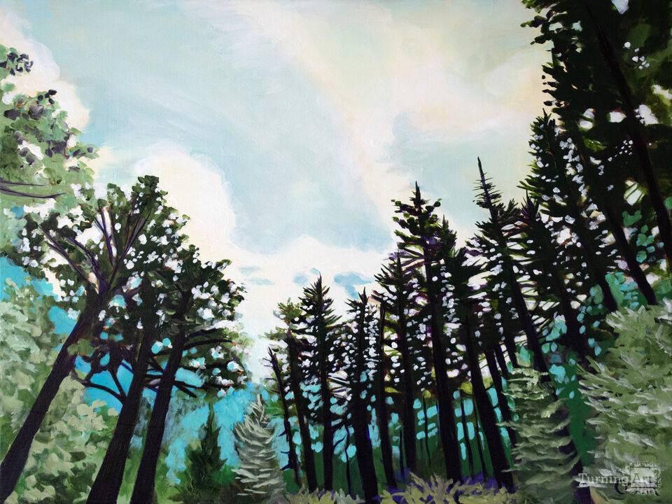 Harmonious cool colors of blue and green fill this painting. Ahint of a warm glow shows through the clouds in the top of the sky. The bright teal in the background is a loud, happy color that is not seen in nature except in tropical oceans. This color is interesting and beautiful as the background of a forest scene.