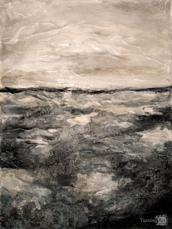 This piece is an atmospheric and expressionist nod to the beauty of the coastal Pacific Northwest, where I live and work. The moody, cloud-covered skies and turbulent, dark waters on a stormy day inspire me greatly and remind me of Nature's majesty. This piece is visually textured with painterly brushstrokes throughout, and it's available in an array of alternate colorways to suit varied decor preferences and palette requirements.
