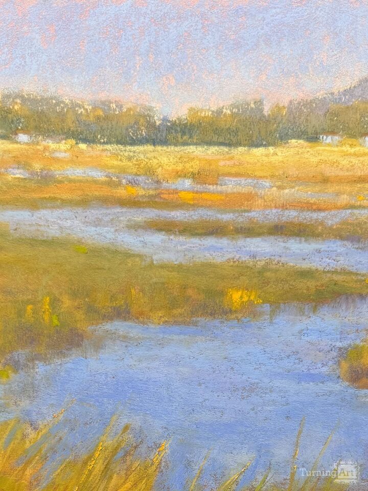 Dina's process looks like this: It always starts with music, which serves to influence what happens on her canvas. At her easel, there is a lot of singing (slightly off key) and there are spontaneous dance parties. Her canvas is a gritty piece of paper, sometimes purchased, sometimes hand-made. With the music on, she uses a photo reference she has taken for inspiration and sketches her composition on her canvas. Sometimes, there isn't a photo reference at all but rather an idea in her head that she works from. She doesn't typically pre-select the colors or values of pastels that she uses, preferring to choose pastels that speak to her in the moment. She often starts with an underpainting, which is the first layer of a painting, using rubbing alcohol to set it permanently on her canvas. She has found that vodka, gin or tequila will work in a pinch when rubbing alcohol isn't available. Sometimes there are happy accidents at the easel and sometimes tragic outcomes but regardless, being at her easel is her favorite place to be.
