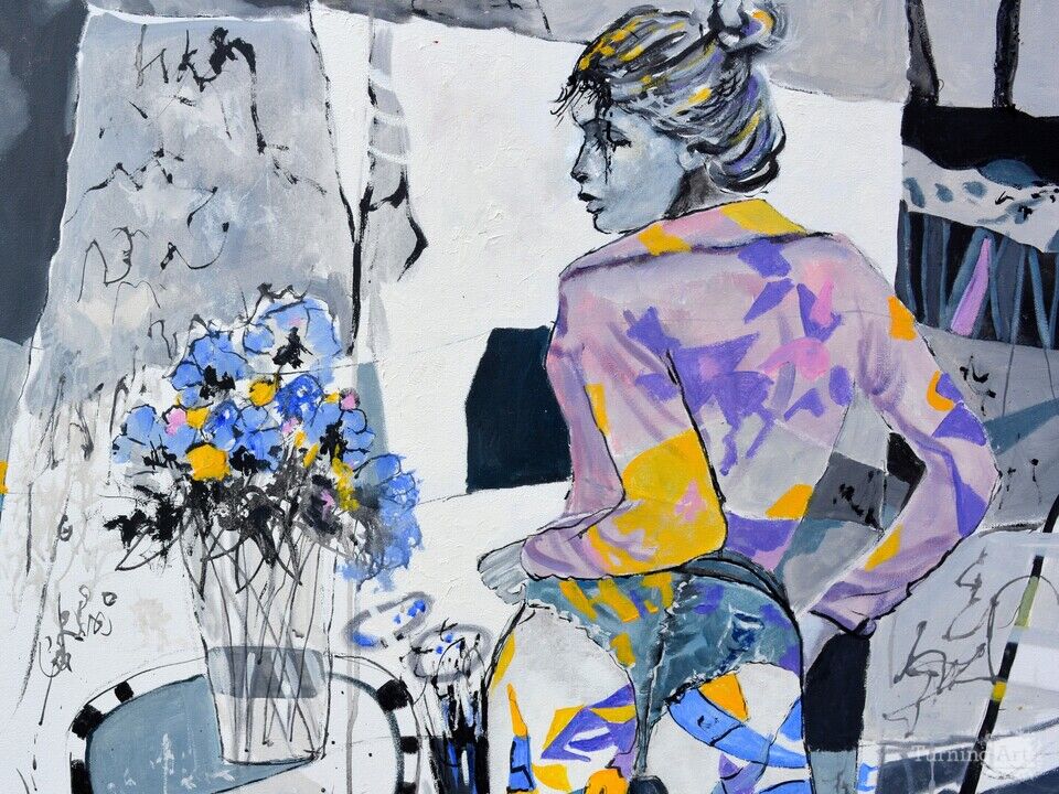 Sarah oil on canvas 80 x 80 cm – This captivating work features a woman elegantly posed from behind, her gaze turned toward an unseen viewer. The composition, a sublime blend of abstraction and figuration, uses a bold palette of purple, blue, and yellow. The juxtaposition of geometric shapes and flowing lines creates an intriguing visual dynamism. The woman’s colorful shirt, with its vibrant patterns, immediately captures the attention. To the left, a vase of fresh flowers adds a touch of springtime vitality, contrasting effectively with the monochrome background. Each element seems to float in a gravity-free space, emphasizing uncertainty and movement. The artist masters the art of illusion and color, transporting the viewer into a world where imagination triumphs over reality. A work where modernity and emotion intertwine harmoniously.