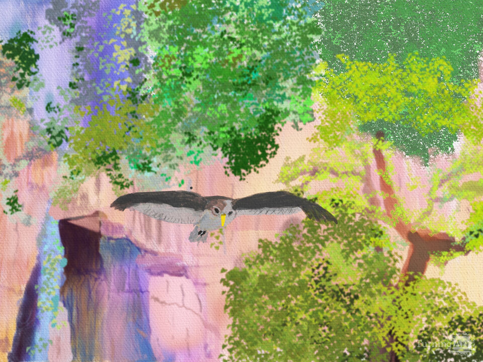 The artwork depicts a bird in mid-flight, soaring with its wings fully extended. The bird's feathers show a gradient of brown with lighter shades underneath, and its head is prominently detailed with a sharp beak. The background consists of a lush, vibrant mix of greens, purples, and pastel colors, representing dense foliage and rocky formations. The brushstrokes and color blending create a textured, impressionistic style, emphasizing the natural setting and the bird's dynamic movement through the air. The overall composition captures a serene moment of nature and wildlife in action.