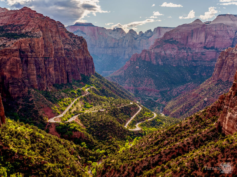 Watching the sunset from the iconic Canyon Overlook Trail in Zion National Park was a beautiful moment. Captured just before the sun slipped behind the mountains, this scene showcases the towering red rock cliffs that define Zion’s dramatic landscape. Far below, the winding switchbacks of Highway 9, also known as the Zion–Mount Carmel Highway or Zion Scenic Byway, carves its way through the canyon, adding depth and scale to the view. Soft evening light brushes across the cliffs while scattered clouds reflect the warm glow of sunset, creating a peaceful yet powerful scene in Springdale, Utah, USA.