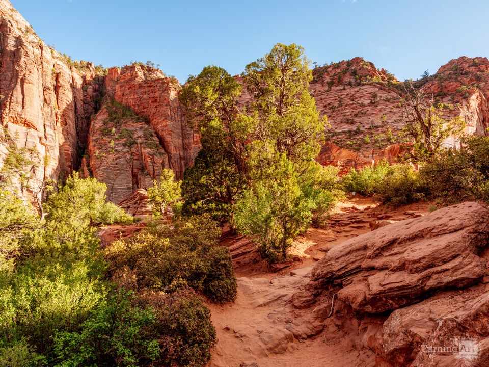The warm sunlight casts shadows and highlights on the trees and red rock cliff mountains at Zion National Park in Utah, United States. The golden light brings out the orange tones in the sandstone rocks. This beautiful view is along the iconic Zion Canyon Overlook hiking trail. It was a beautiful spring season evening and the trees where showing off their fresh green colors adding contrast to the southwest terrain and the blue sky above.