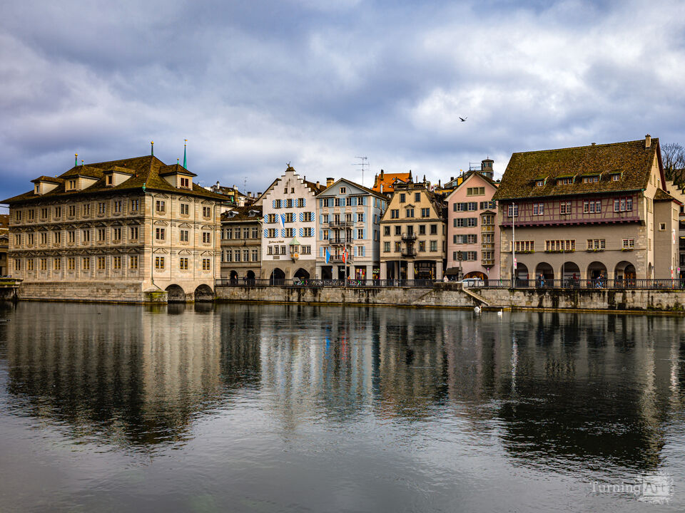 A view of the Rathaus and other historic buildings from across the river Limmat in Zurich, Switzerland.