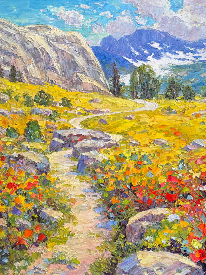 At eighteen, Teare traveled to Northern Idaho, where he built a log cabin at the foot of Moscow Mountain and spent a year painting watercolors by kerosene lamp through the long winters. That summer, while working on trail crews in the Cascade Mountains, he was deeply moved by the Alpine Lakes Wilderness. Surrounded by wild beauty and vast silence, he knew he would one day devote himself fully to landscape painting. Today, Teare lives in Providence, Utah, painting bold, textured vistas with a palette knife—honoring both the structure of printmaking and the wildness of the American West.