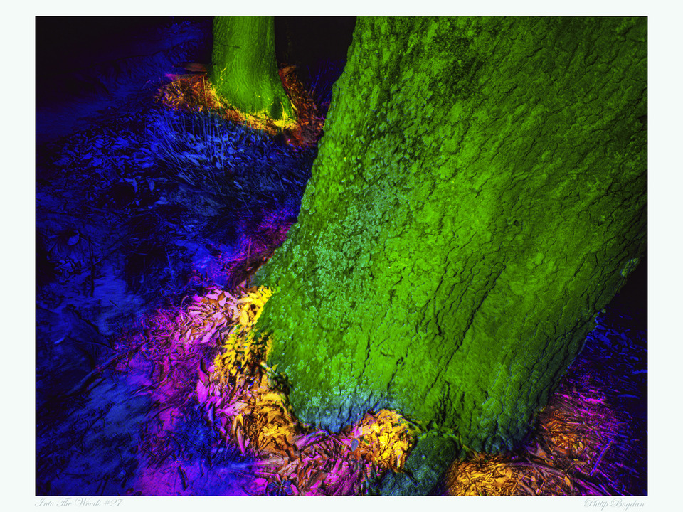 Later, as the sun was setting, I would carry my backpack, filled with 90 lbs. of large-format photographic equipment, to the exact coordinates and prepare for my all-night shoot. What began as an adventure gradually transposed into an earnest study of the lives of the forest trees. All photographs were made in complete darkness with a wide variety of filters and light sources. I began to challenge myself by creating a week's worth of night shoots on a single piece of 5×7 sheet film. In 2002, I expanded my objectives to create images based on up to fourteen nights of shooting on only one sheet of film. The complexity of these images challenged me to the point where I felt that I had reached my maximum capacity for performance in this endeavor.