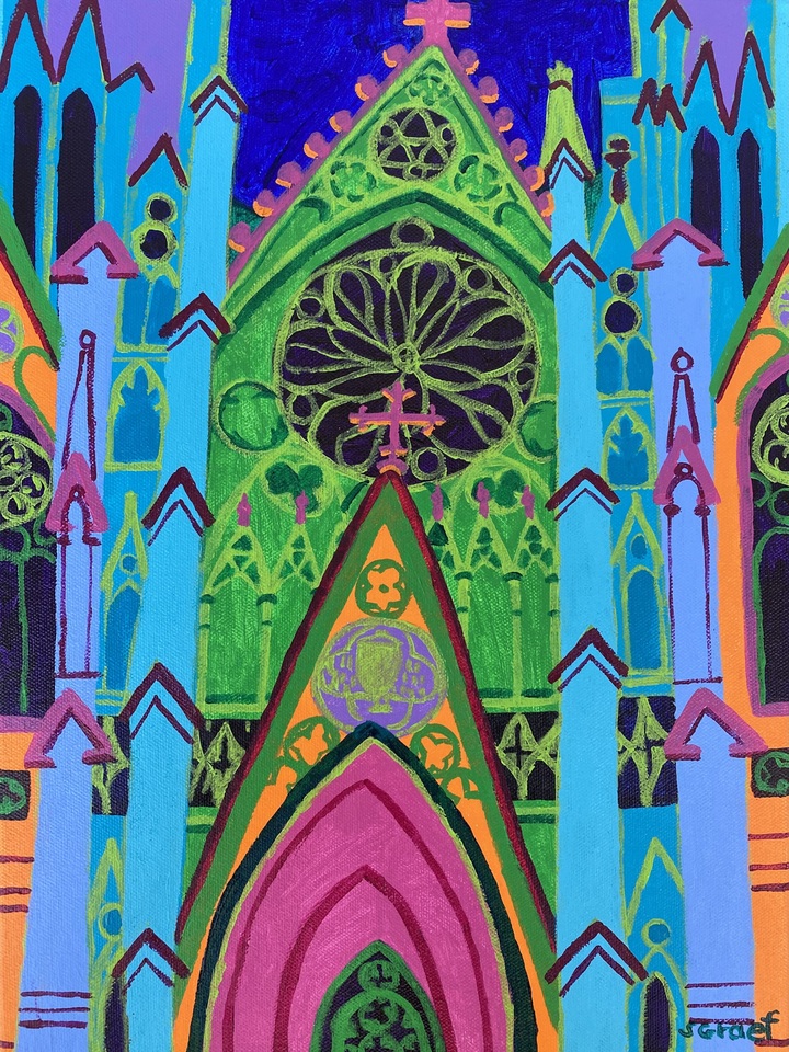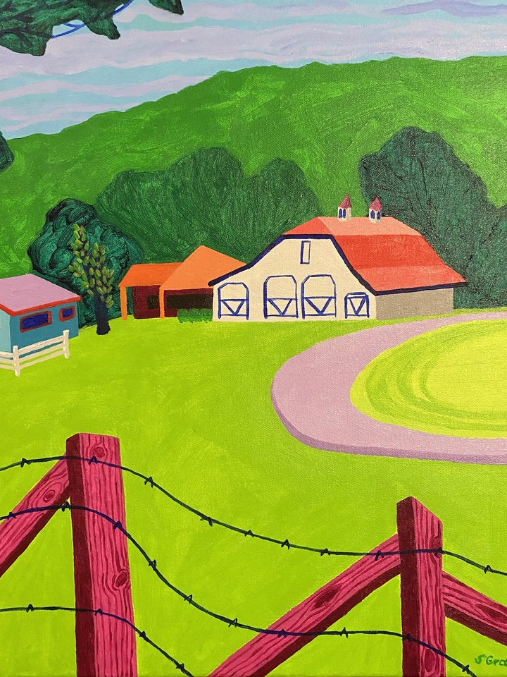 Her works are vibrant acrylic landscape paintings on stretched canvas, lightheartedly expressing her vision of the world.